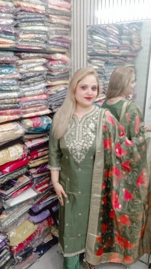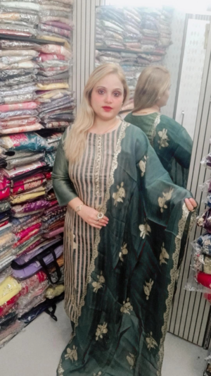 Designer Muslin Silk Kurti Set with Heavy Moti Work & Digital Print Silk Bottom | Muslin Dupatta |