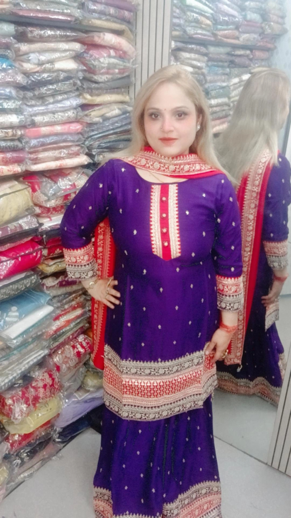 Make a statement with this exquisite Sharara suit, crafted from luxurious pure organza and adorned with intricate heavy embroidery. Available in two stunning color combinations—blue-maroon and blue-parrot green—this suit is a masterpiece of elegance and style. Perfect for festive occasions, weddings, and celebrations, this outfit brings a touch of regal charm to your wardrobe.