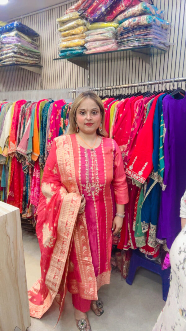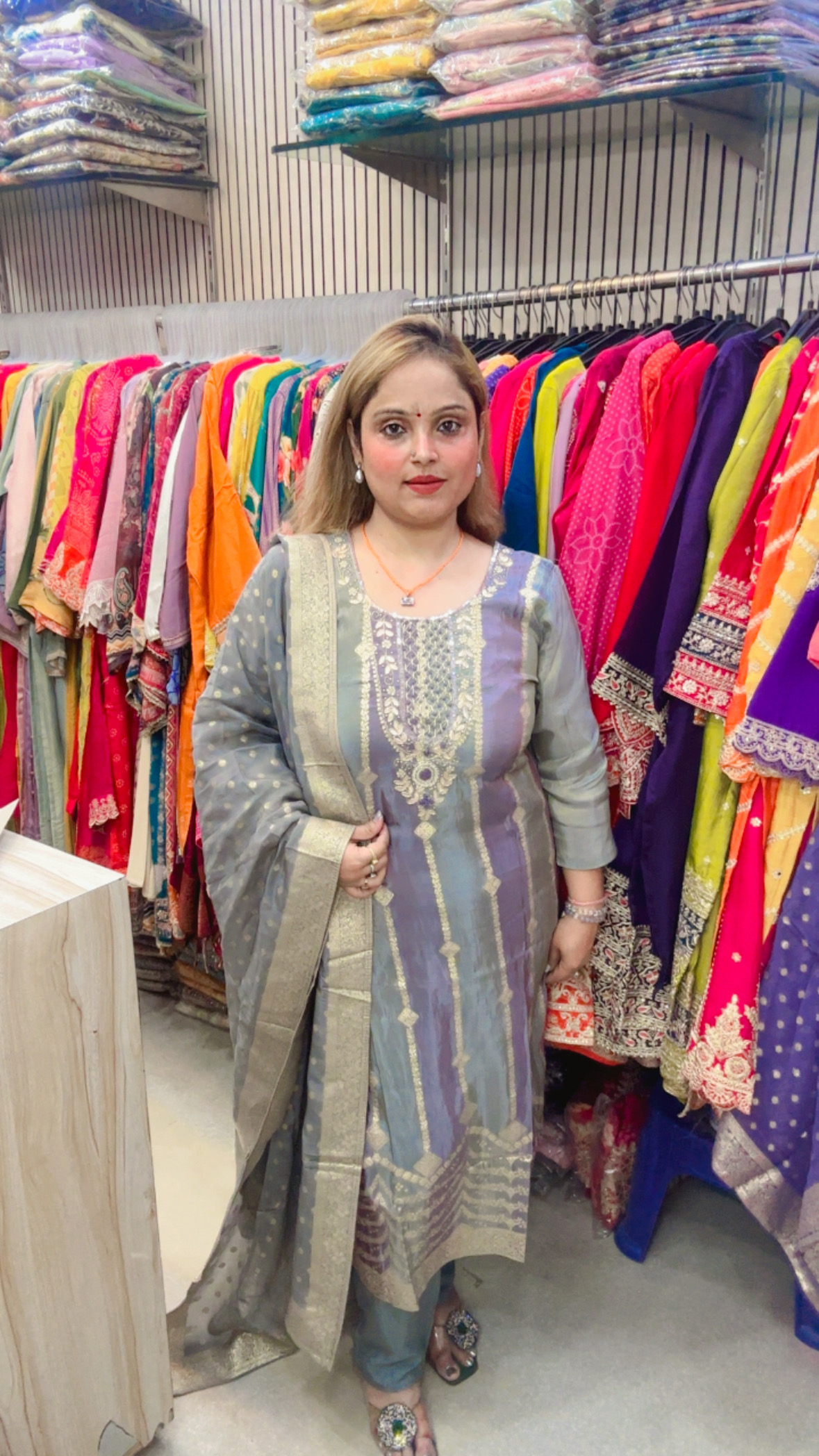 Embrace luxury and tradition with this elegant Organza Pant Suit, designed with rich detailing and a stunning Banarasi-inspired dupatta for a regal finish.
