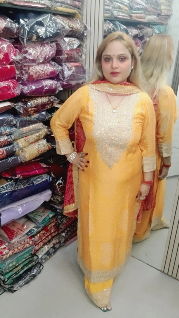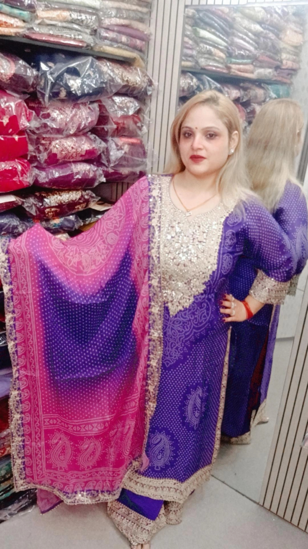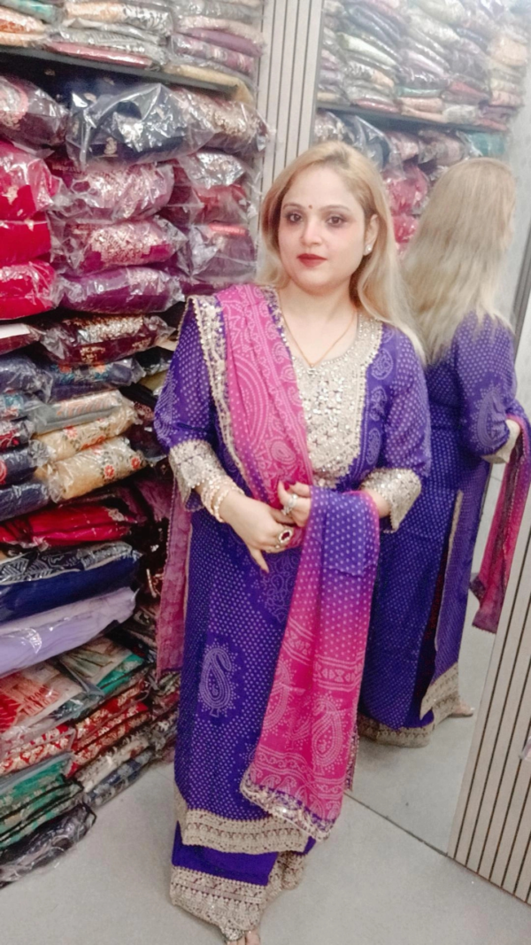 Pure Chinnon Suit with Pants – Bandhej Pattern & Fine Embroidery