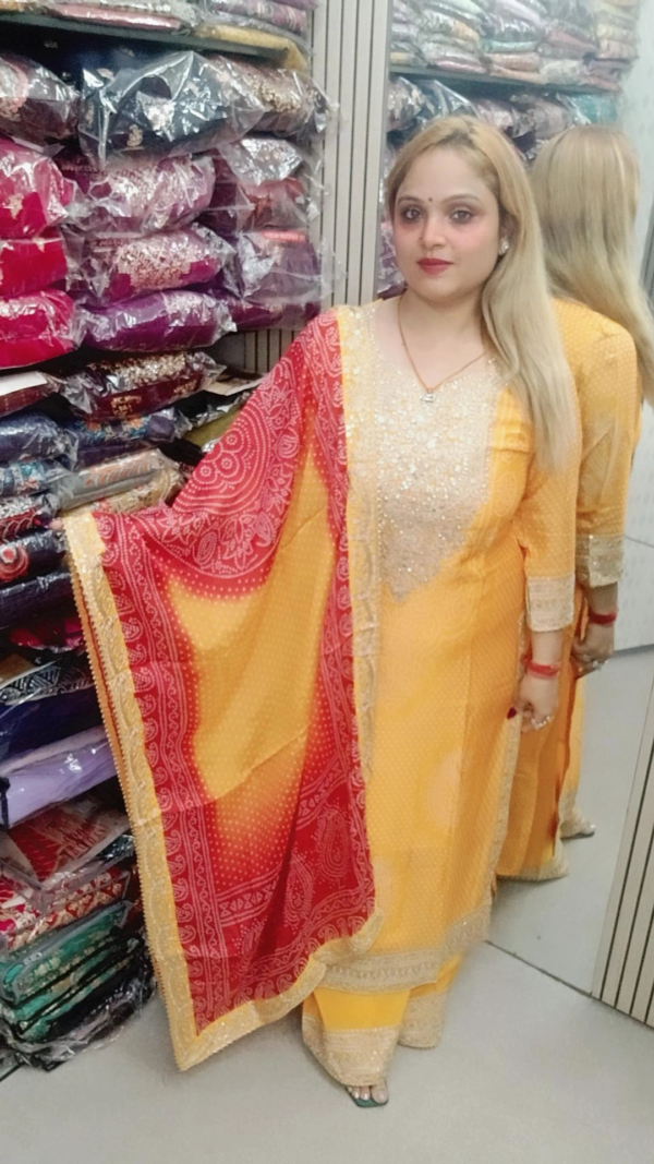 - Dupatta: Matching Bandhej Dupatta that enhances the overall look with its vibrant pattern.