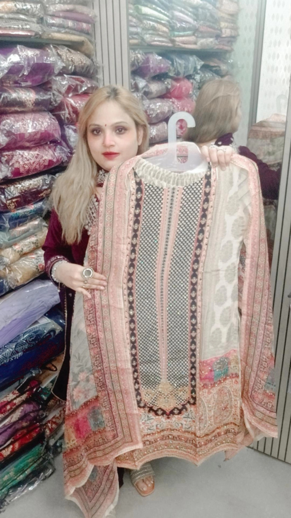 Be the first to review “Pure Chinnon Suit with Polka Dots, Mirror Work, and Matching Dupatta”
