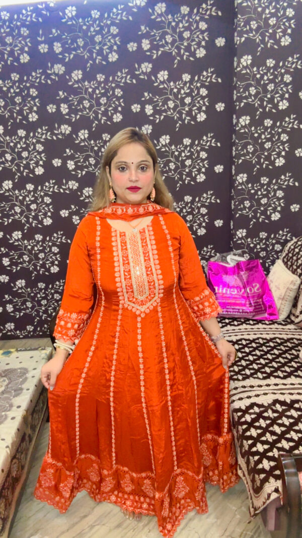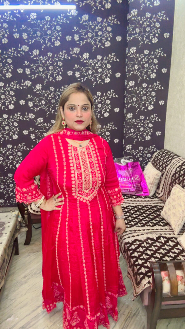 Step into timeless elegance with this Pure Chinon Anarkali Suit, designed with intricate craftsmanship and rich detailing for a graceful festive look.