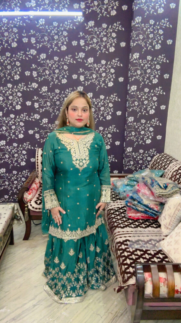 Step into elegance with this Pure Chinon Sharara Suit, designed with luxurious detailing and a graceful silhouette for special occasions.