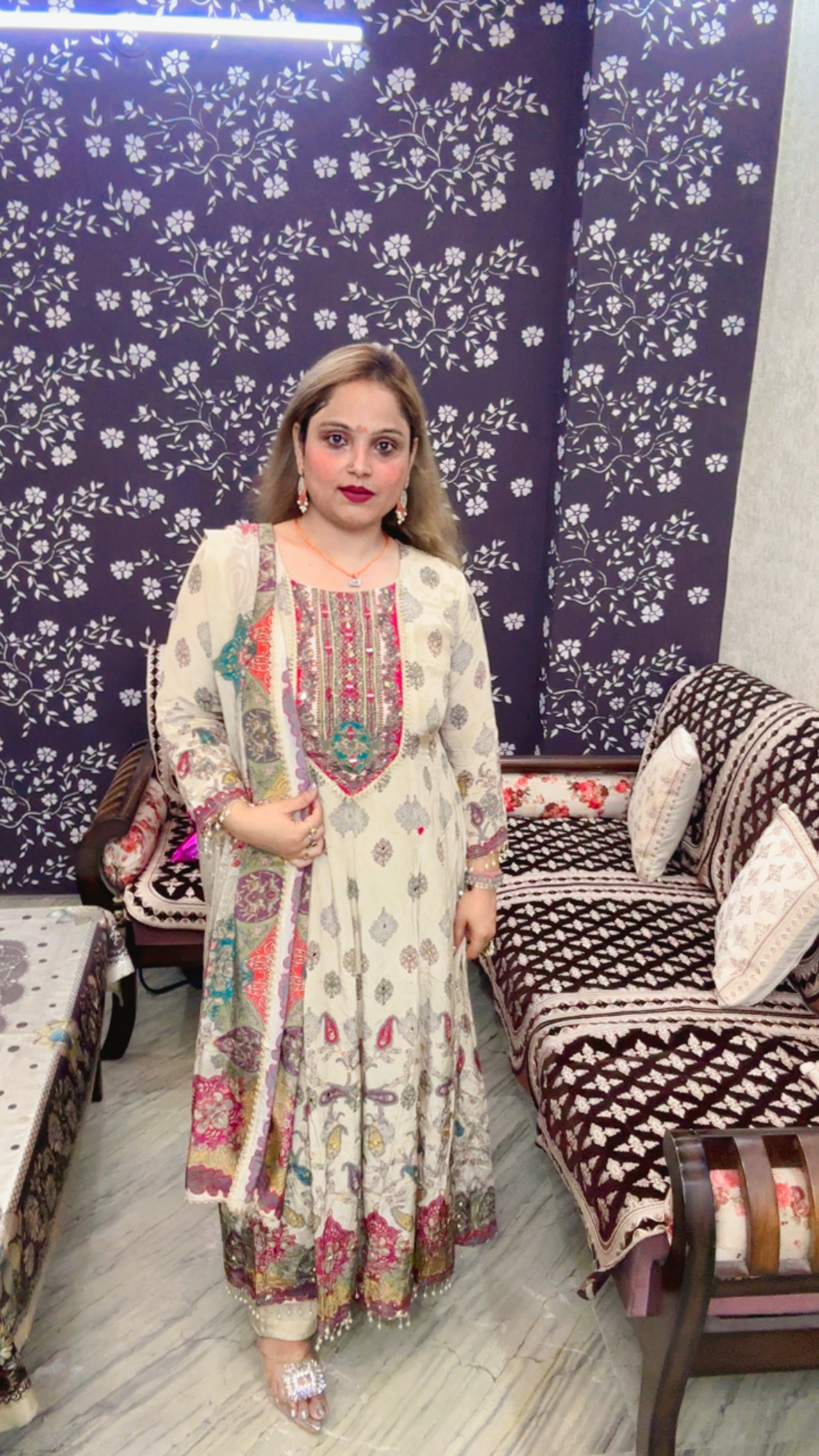 Add a touch of festive sparkle to your wardrobe with this elegant Pure Crepe Anarkali Suit, blending contemporary digital prints with timeless mirror detailing.