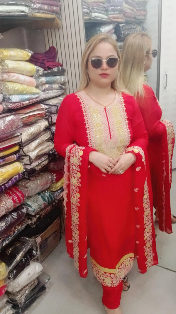Red Pure Organza Pant Suit with Neck Patch & Dupatta