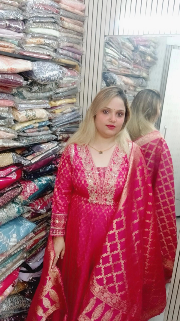 Vibrant Anarkali Suit with Golden Embroidery in Pure Banarasi Fabric